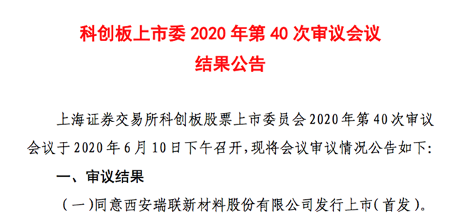 6月10日,科创板上市委第40次审议会议公告显示,同意西安瑞联新材料股份有限公司(以下简称“瑞联新材”)发行上市(首发)。