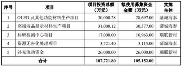 招股书披露,此次瑞联新材科创板IPO拟首次公开发行人民币普通股(A 股)不超过1,755万股,不低于发行后总股本的25%,募集总金额为105152万元,扣除发行费用后的净额将全部用于主营业务相关的项目。其中,28697万元用于OLED及其他功能材料生产项目,30377万元用于高端液晶显示材料生产项目。