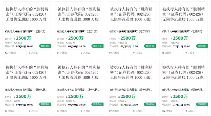 6月3日,据阿里拍卖公众号显示,日前,江苏省苏州市中级人民法院在阿里拍卖上挂出一批股权,将于7月1日10时至7月2日公开拍卖“胜利精密”(证券代码:002426)无限售流通股8000万股股票。