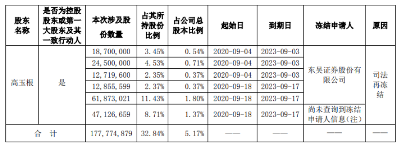 事实上,早在2020年9月21日,*ST胜利就发布公告称,获悉高玉根所持有公司股份约1.78亿股被司法冻结,占其所持股份的32.84%。本次拍卖的共计8000万股。