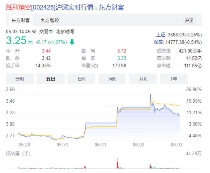 6月3日,胜利精密还发布了股票交易异常波动公告,公司股票于2021年6月1日和6月2日连续二个交易日收盘价涨幅偏离值累计超过20%。不过,被拍卖消息一出,其股价便开始出现下滑,截至发稿,胜利精密报价3.25元/股,跌幅达4.97%。(校对/Jack)