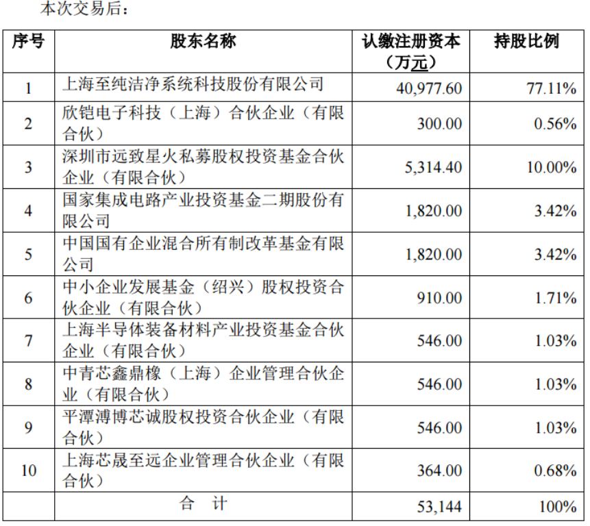 12月20日,据至纯科技再次发布公告表示,本次交易在至微半导体估值 250,000 万元的基础上,增资方以货币方式向至微半导体出资合计 42,000 万元,同时远致星火出资 23,200万元受让至纯科技持有至微半导体的对应本次增资后的 7.95%的股权,原股东颀铠电子无条件放弃优先购买权,远致星火持有至微半导体股份达到10%。