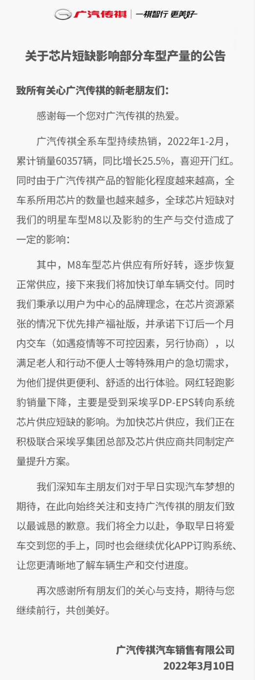 3月10日,广汽传祺称,全球芯片短缺对旗下M8以及影豹车型的生产和交付造成了一定影响。其中,M8车型芯片供应有所好转,逐步恢复正常,影豹销量下滑则是主要受到采埃孚DP-EPS转向系统芯片供应短缺的影响。