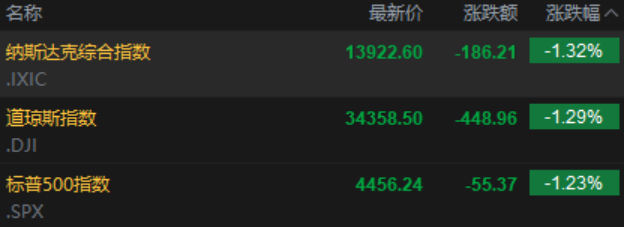 美股方面,道指收跌448.96点,跌幅1.29%,自3月7日上上周一以来首次收盘跌超400点,报34358.5点,全数回吐周二涨幅。纳指收跌1.32%,报13922.6点,和道指均跌离周二所创的2月16日以来高位。标普收跌1.23%,和纳指均创3月11日上上周五以来最大收盘跌幅,报4456.24点,周二创2月9日以来收盘新高。