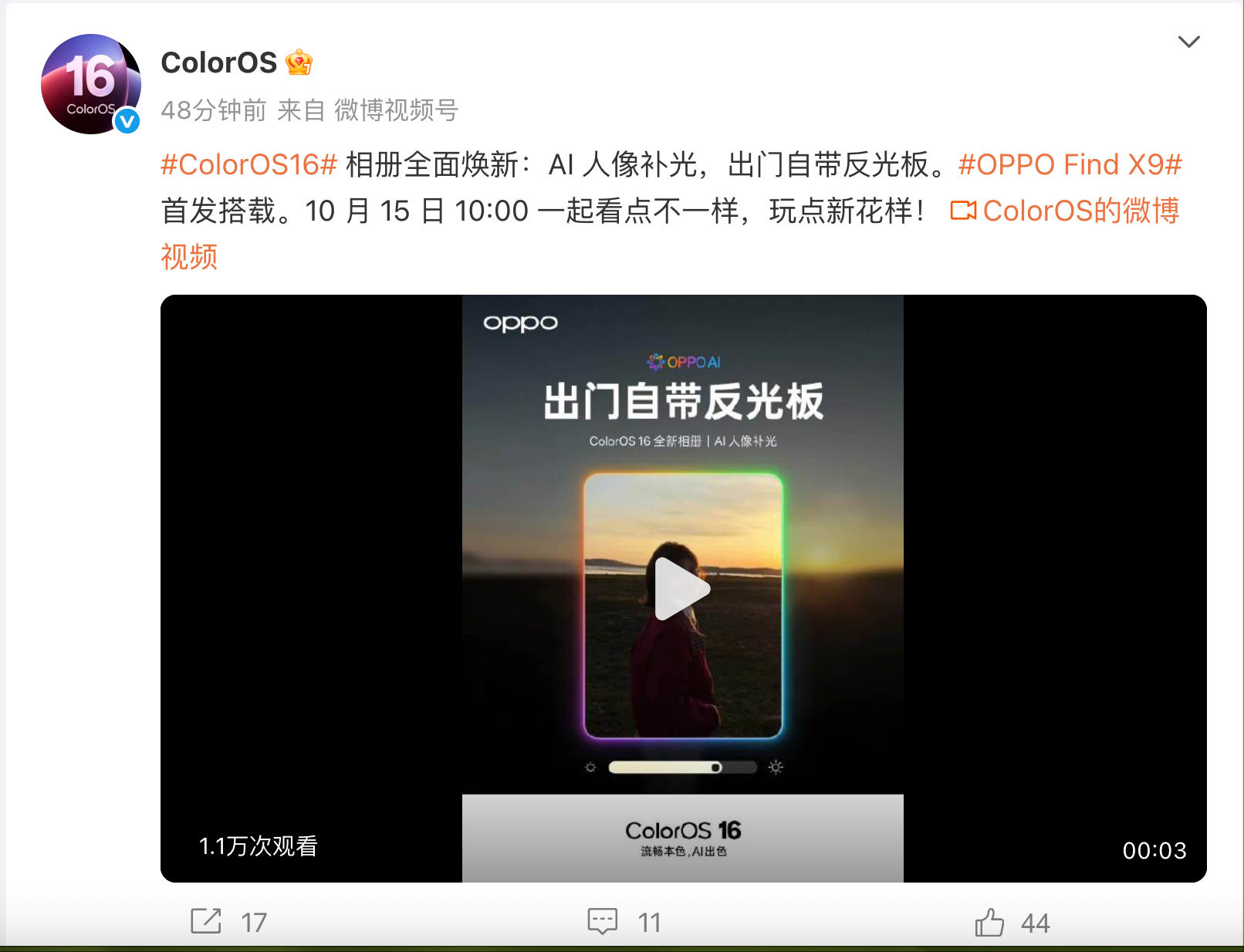 9月25日,OPPO、一加手机操作系统官方微博宣布,Color OS 16系统相册上新AI人像补光功能,官方称“出门自带反光板”“一键帮你修复废片”,该功能将在OPPO Find X9系列上首发 。