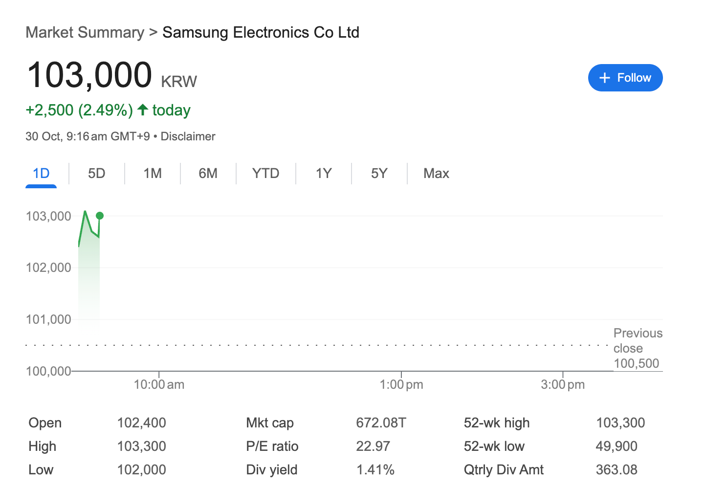 三星今天在韩国交易所的开盘价为10.24万韩元。截至发稿,三星股价在早盘交易中上涨2500韩元至10.3万韩元,涨幅为2.49%。过去52周,三星股价最高为10.33万韩元,最低为4.99万韩元。