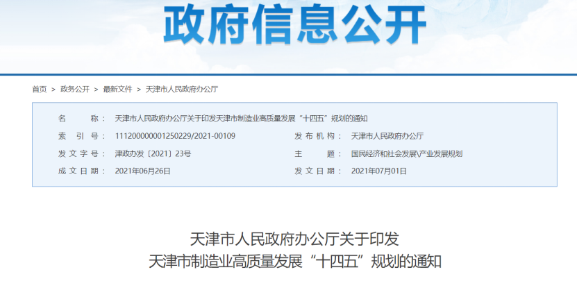 7月1日,天津政务网公布《天津市制造业高质量发展“十四五”规划》(以下简称《规划》)。根据规划,到2025年,天津将基本建成研发制造能力强大、产业价值链高端、辐射带动作用显著的全国先进制造研发基地。