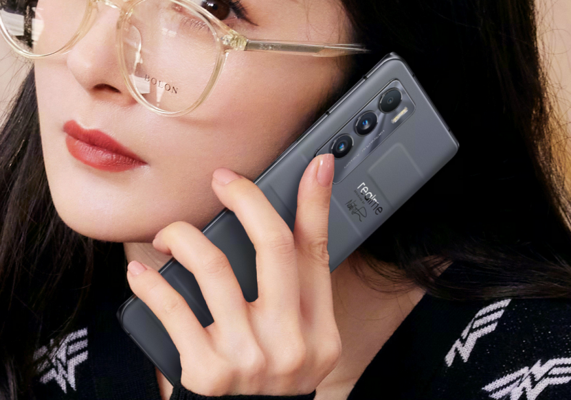 而在今天中午,realme 真我手机代言人杨幂的工作室账号上传了一组杨幂手持真我新机的高分辨率照片,预计应该是真我GT 大师系列的其中一款配色。