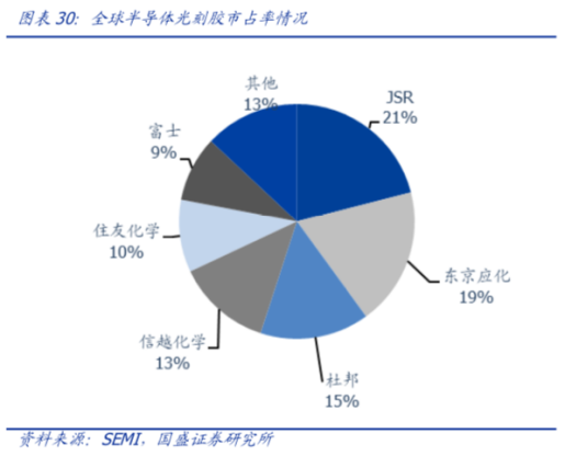 当前,光刻胶市场主要由被日本、美国头部厂商垄断,其中日本占比72%,而中国大陆企业市占率不足13%。有研报指出,高端光刻胶为国外巨头所垄断的行情时刻对我国芯片制造形成威胁。由于光刻胶保质期较短(6-9个月),一旦发生突发事件,中国大陆芯片制造即会受到威胁,因此自主化势在必行。