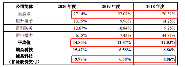 报告期内,铖昌科技所在行业平均研发费用率分别为22.03%、12.57%、14.8%,明显看出,铖昌科技距离行业平均仍有一定的差距。而以景嘉微为例,其在报告期内的研发费用率分别为20.32%、22.07%、27.14%,更是将铖昌科技远远的甩在身后。