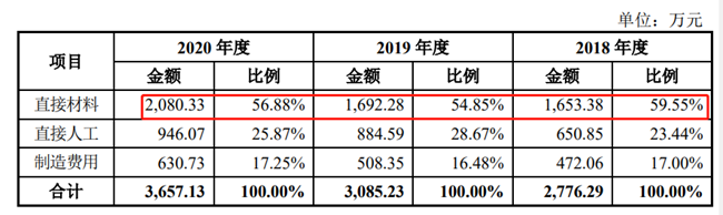 具体来看,铖昌科技相控阵T/R芯片的成本类型包含直接材料、直接人工、制造费用。其中,直接材料的成本金额在报告期内分别为1653.38万元、1692.28万元、2080.33万元,占各期相控阵T/R芯片业务成本的比例分别为59.55%、54.85%、56.88%,近三年均超过了50%。