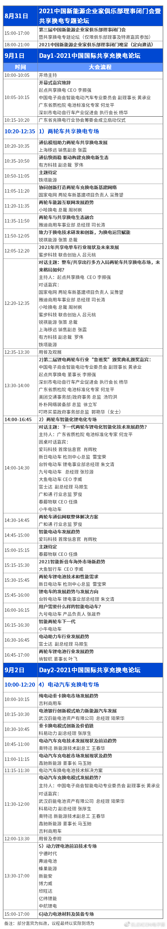 大会为期两天,拟邀请到30+重磅专家演讲,来自共享电单车及换电企业,两轮车整车、充电桩及运营企业,共享换电锂电池厂商,换电整体方案商及换电柜、储能企业、保护板及 BMS 企业,通信物联解决方案商,包括: