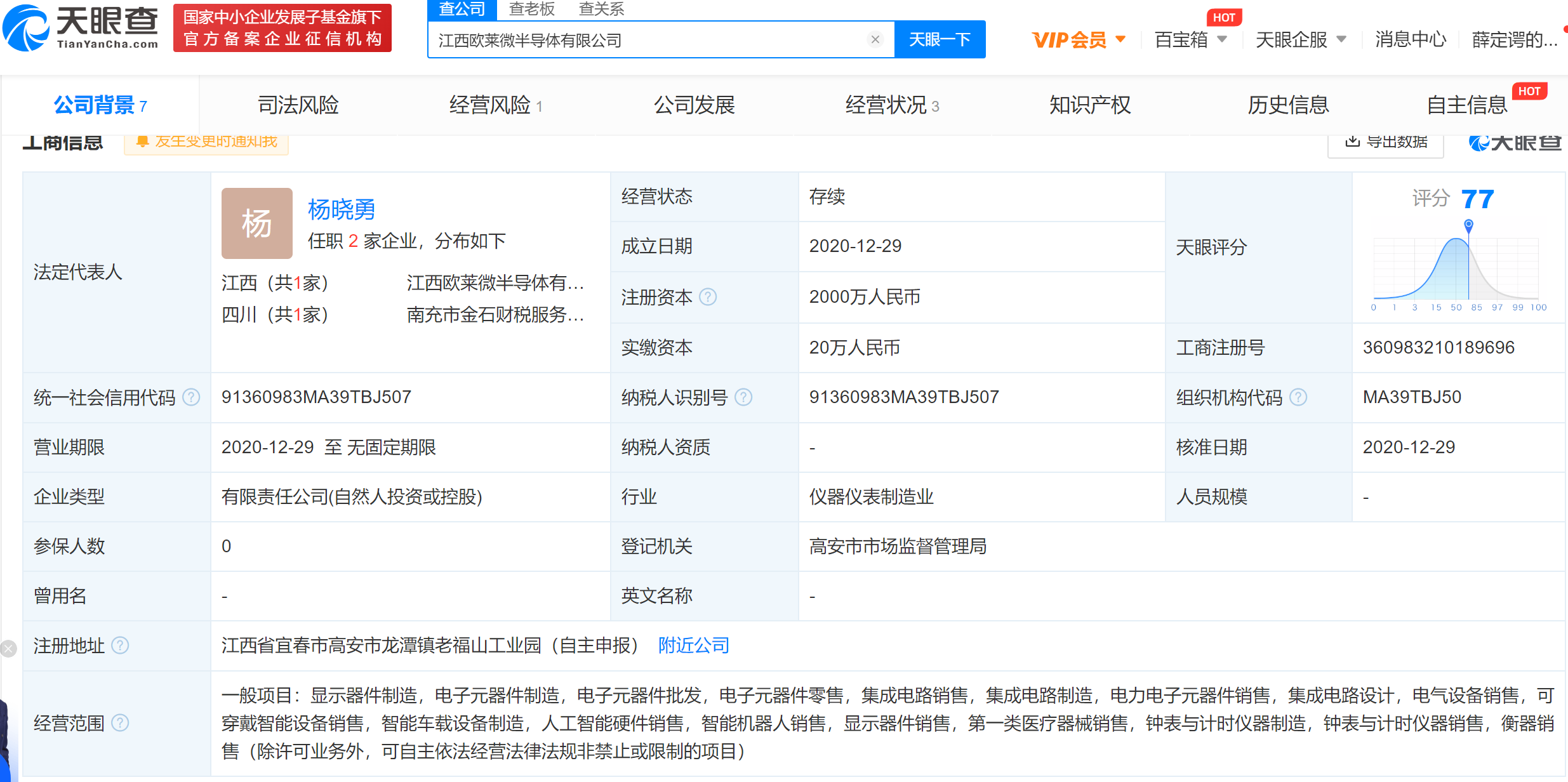 天眼查显示,江西欧莱微半导体有限公司成立于2020年12月,注册资本为2000万元,经营范围涉及:显示器件制造,电子元器件制造,电子元器件批发,电子元器件零售,集成电路销售,集成电路制造,电力电子元器件销售,集成电路设计,电气设备销售,可穿戴智能设备销售,智能车载设备制造,人工智能硬件销售,智能机器人销售,显示器件销售等。公司股东包括:龙庆平以及深圳市华显晶光电科技有限公司。