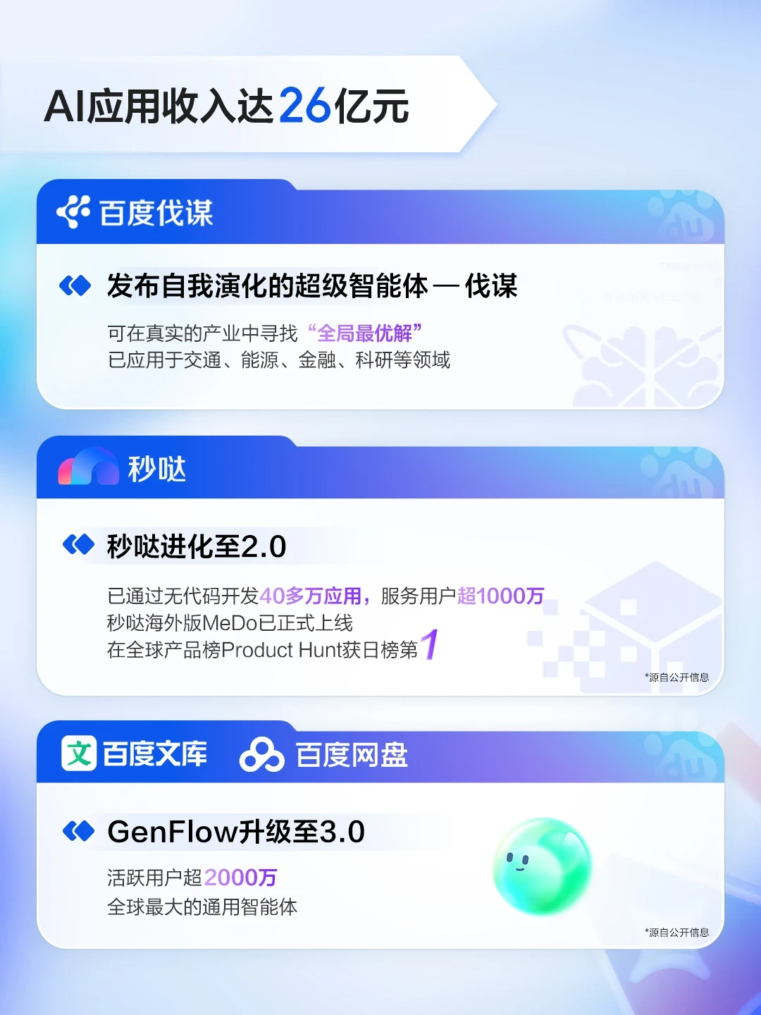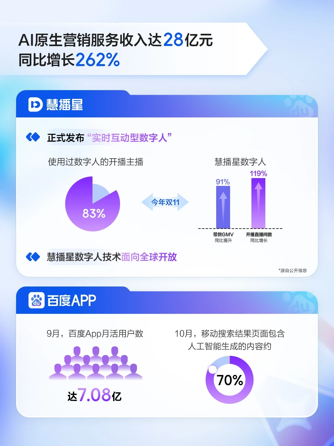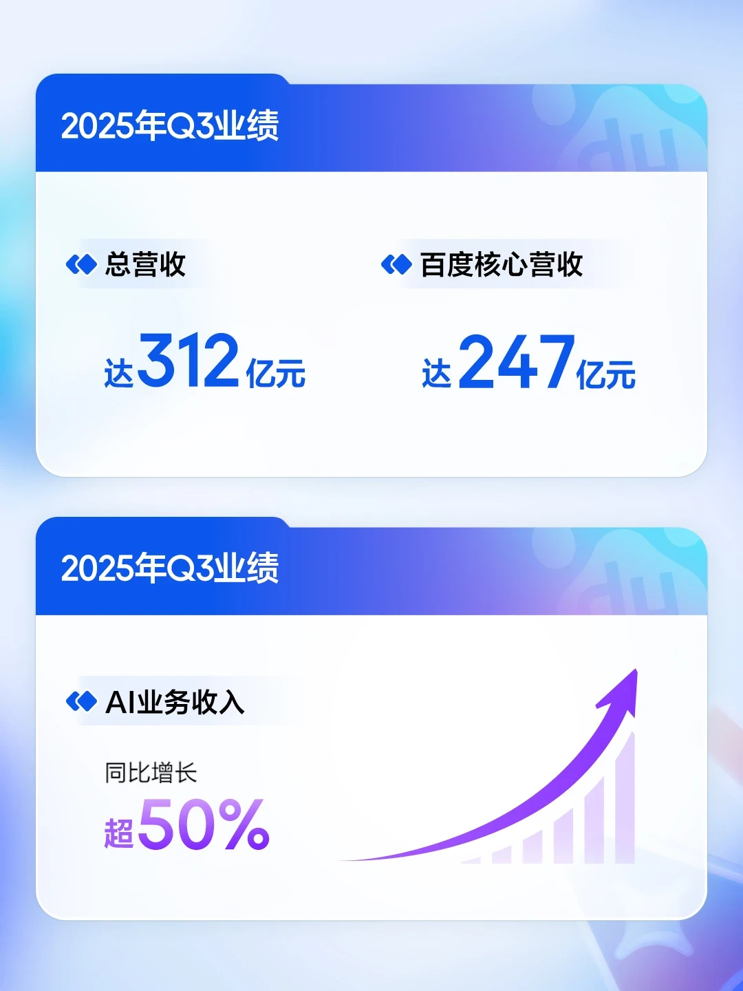 百度2025年Q3财报:总营收312亿元 AI业务收入增速超50%