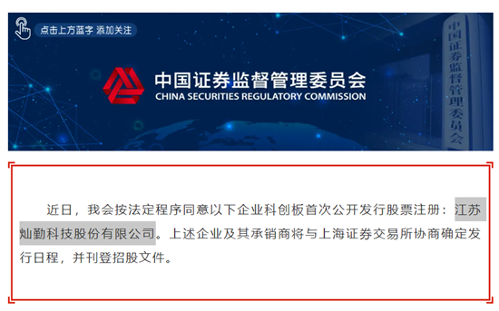10月12日,证监会官微发布消息称,证监会按法定程序同意江苏灿勤科技股份有限公司(以下简称“灿勤科技”)科创板首次公开发行股票注册,灿勤科技及其承销商将分别与上海证券交易所协商确定发行日程,并陆续刊登招股文件。