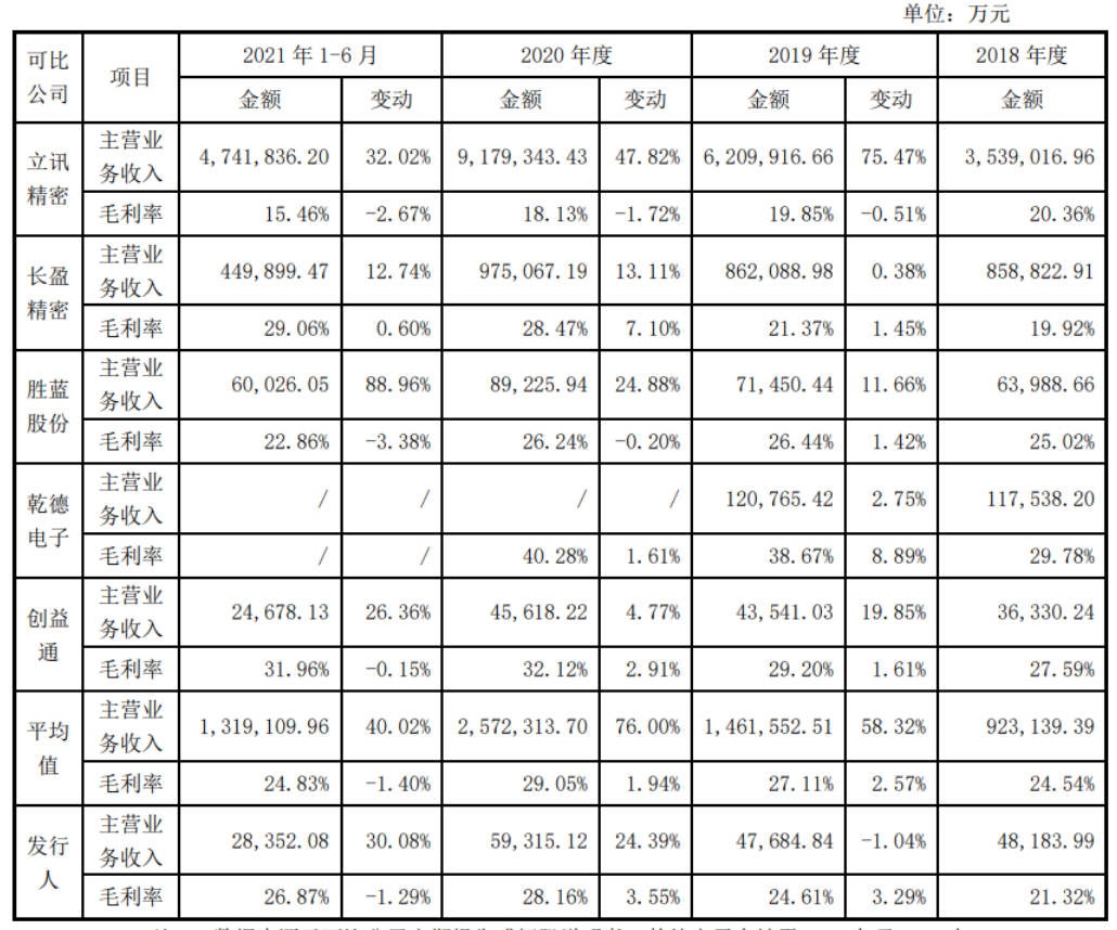 立讯精密为国内连接器领域的龙头企业,产品种类较多且应用领域较广,产品广泛应用于电脑及周边产品、消费电子、通讯、汽车及医疗等领域。报告期各1-84期,立讯精密主营业务收入分别为353.90亿元、620.99亿元、917.93亿元及474.18亿元,规模较大且增长较快,同行业其他可比公司销售收入规模及增速与立讯精密相比存在较大差距。近三年,立讯精密主营业务毛利率分别为20.36%、19.85%及18.13%,毛利率水平并未随着收入规模的快速增长而发生较大波动,逐年略有下降,整体保持稳定。从收入结构来看,近三年立讯精密前五大客户销售占比分别为68.43%、77.04%及82.03%,其中第一大客户销售占比分别为44.85%、55.43%及69.02%,主要客户基本为全球知名的消费电子品牌厂商或EMS制造商,主要客户销售占比较高且客户集中度逐年提升。总体看来,立讯精密与发行人及其他同行业可比公司相比,销售规模较大,客户集中度较高,主营业务毛利率逐年略有下降,整体保持稳定。
