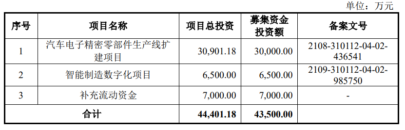 拟募资4.35亿元,用于汽车电子精密零部件生产线扩建等项目