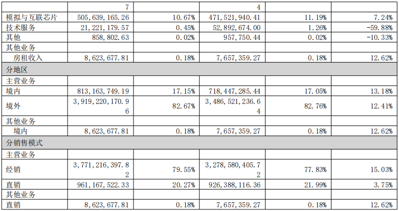 计算芯片业务实现收入12.93亿元,同比增长18.65%,主要得益于智能安防、智能物联网等领域需求增长。模拟与互联芯片业务实现收入5.06亿元,同比增长7.24%,车规级LED驱动芯片在汽车照明市场渗透率持续提升。