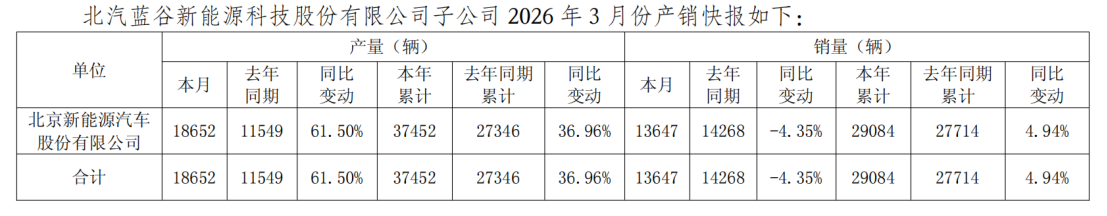 4月1日,北汽蓝谷发布子公司2026年3月产销快报。3月单月产量18652辆,同比增长61.5%;1-3月累计产量37452辆,同比增长36.96%。3月销量13647辆,同比下降4.35%;1-3月累计销量29084辆,同比增长4.94%。