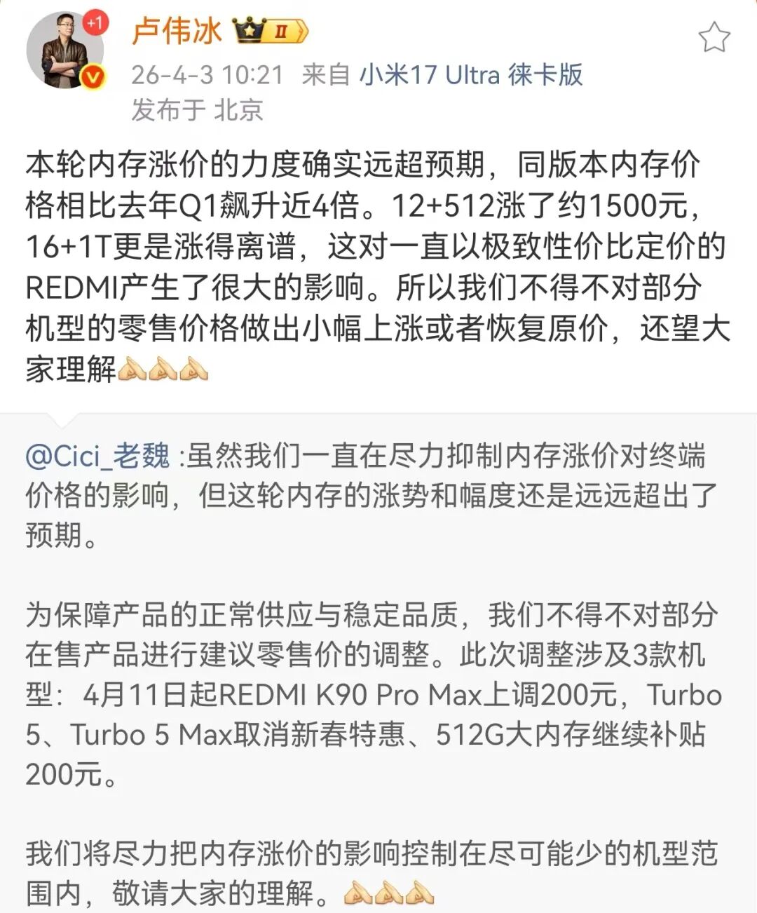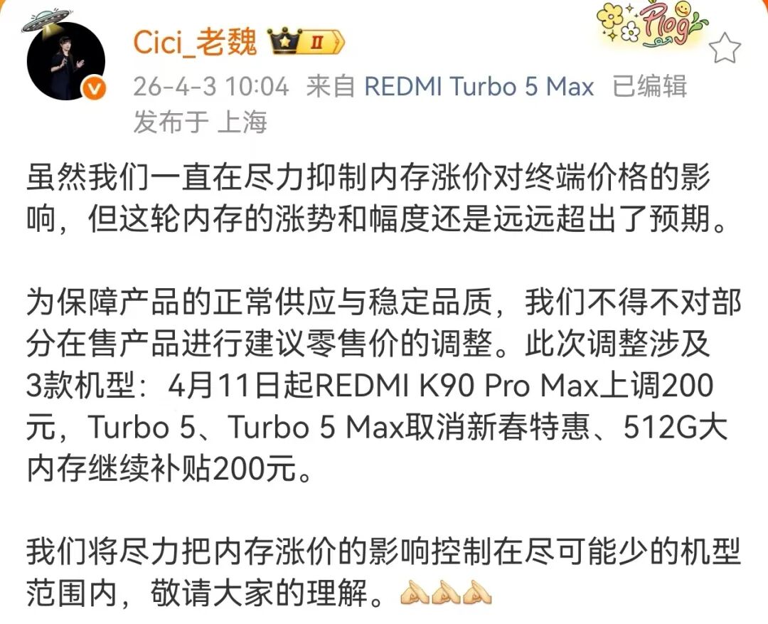 小米中国区市场部总经理魏思琪4月3日在微博发文称,此次调整涉及3款机型,4月11日起,REDMI K90 Pro Max上调200元;Turbo 5、Turbo 5 Max取消新春特惠,512G大内存继续补贴200元。