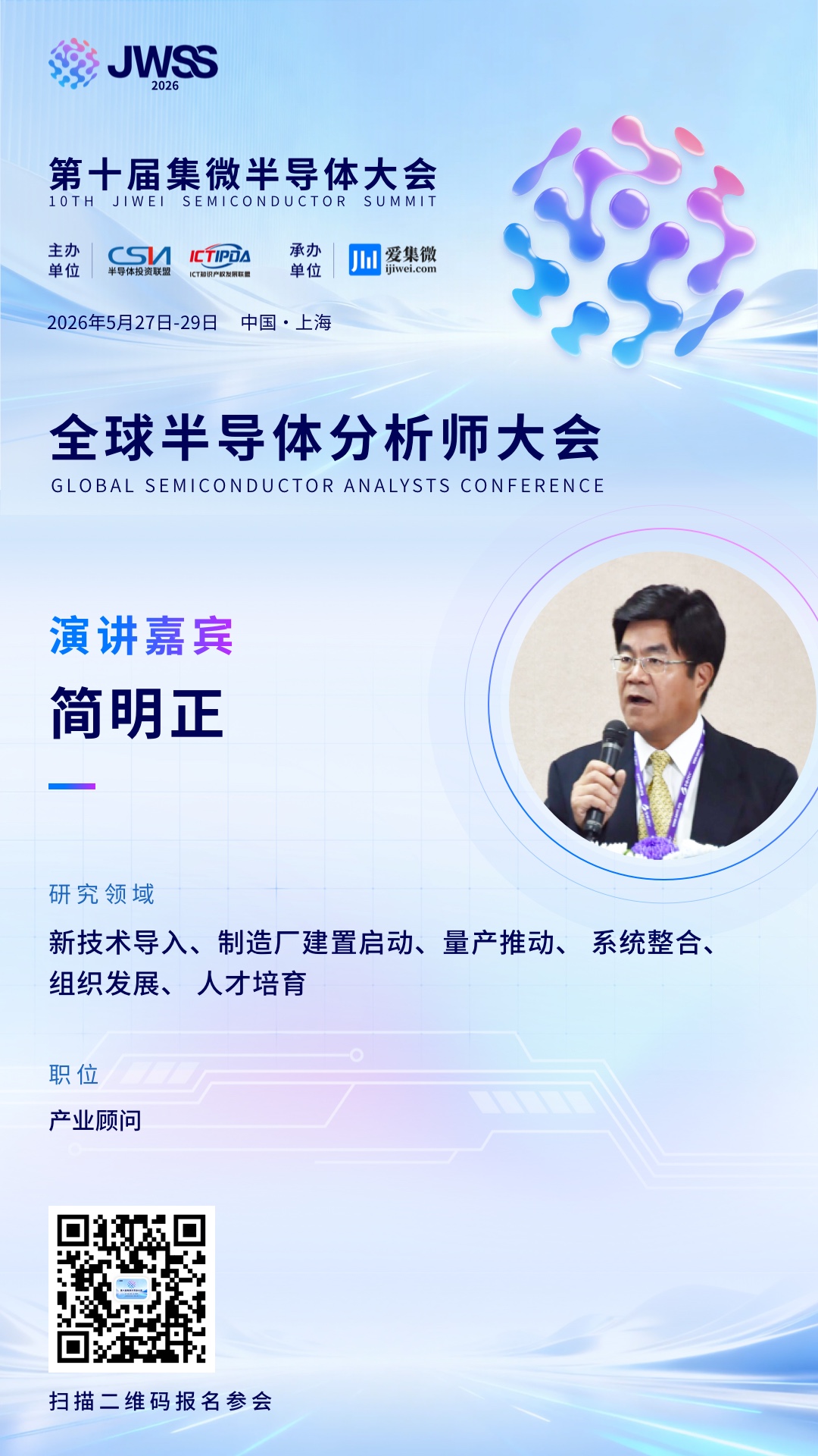 我们荣幸邀请到台湾地区产业顾问Robert Chien(简明正)出席本次大会,他将带来题为《半导体行业的智能制造》的深度分享,结合其多年一线实战经验,解码智能制造的落地路径。