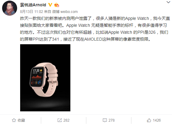 在此之后,华米科技创始人、CEO黄汪进一步披露了新款手表的消息,他表示: