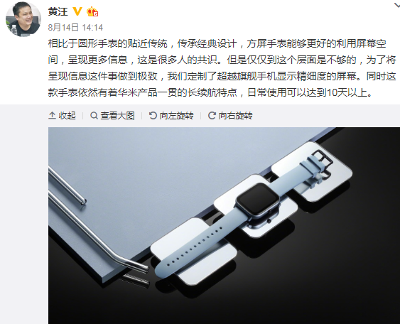 “相比于圆形手表的贴近传统,传承经典设计,方屏手表能够更好的利用屏幕空间,呈现更多信息,这是很多人的共识。但是仅仅到这个层面是不够的,为了将呈现信息这件事做到极致,我们定制了超越旗舰手机显示精细度的屏幕。同时这款手表依然有着华米产品一贯的长续航特点,日常使用可以达到10天以上。”
