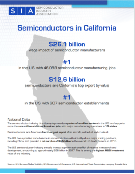 加州在美国半导体行业内的地位举足轻重。根据美国半导体行业协会(SIA)2019年的报告,半导体行业带动的工资支出总计达到261亿美元;加州在美国总共提供了46,089个半导体行业的岗位,位列全美第一;按价值计算,半导体在加州所有出口产品中位列榜首,达到126亿美元;加州共有607家半导体企业,同样位居全美第一。