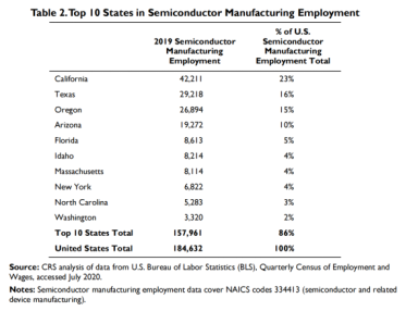 而美国Congressional Research Service在2020年10月的研究报告则显示,加利福尼亚州、得克萨斯州和俄勒冈州提供了美国半导体行业中超过一半的就业岗位,而在2019年,仅加州就提供了美国国内超过五分之一的半导体行业就业岗位。