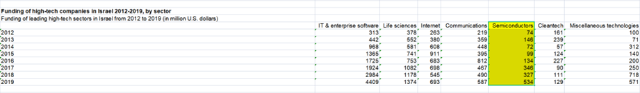 2012-2019以色列高科技公司资金投入情况,半导体类别的公司从7400万美元增长到5.34亿美元