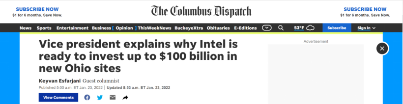 除了俄亥俄州自身的实力之外,该州在宣传工作上也付出了巨大的努力。笔者在梳理英特尔选择俄亥俄州建厂的始末时发现了一个有趣的现象,俄亥俄州当地报纸The Columbus Dispatch对于英特尔在该州建厂的报道可谓翔实全面,比如2022年1月21日,英特尔官宣当天,该报就在其网站上发表了题为《Mike DeWine和Jon Husted如何让英特尔来到俄亥俄州》的文章(Mike DeWine是俄亥俄州州长,Jon Husted为俄亥俄州副州长)。仅仅两天后,2022年1月23日,该报网站又刊登了一篇文章详解英特尔为何选择俄亥俄州投资1000亿美元,而该文作者Keyvan Esfarjani正是英特尔首席全球运营官、执行副总裁,负责监督英特尔的制造、供应链和运营。2022年1月27日,该州的经济发展部门JobsOhio的首席执行官兼总裁J.P. Nauseef还加入了雅虎财经直播(Yahoo Finance Live),解答俄亥俄州为什么能赢得英特尔的青睐。刚一官宣就动作频频必然是早就有所准备,不难想象在争取英特尔的过程中,俄亥俄州的许多部门都已然付出了巨大的努力。在争取到这位“贵客”后,俄亥俄在宣传上也是给足了英特尔面子。