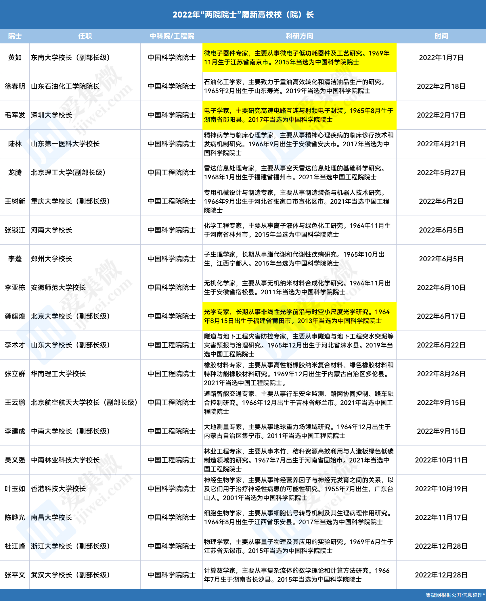 从研究领域来看,与半导体领域密切相关的中科院信息技术科学部在2022年有黄如、毛军发、龚旗煌3位院士履新高校校长: