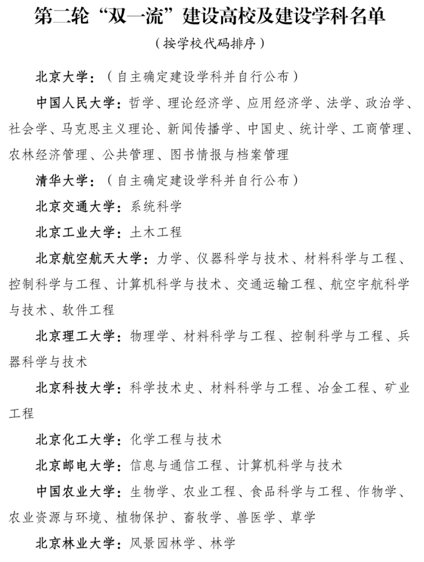 2022年2月9日,教育部、财政部、国家发展改革委联合印发《关于深入推进世界一流大学和一流学科建设的若干意见》,第二轮“双一流”建设名单公布,涉147所建设高校、331个建设学科(不含自定学科)。北京大学、清华大学自主建设的学科自行公布。