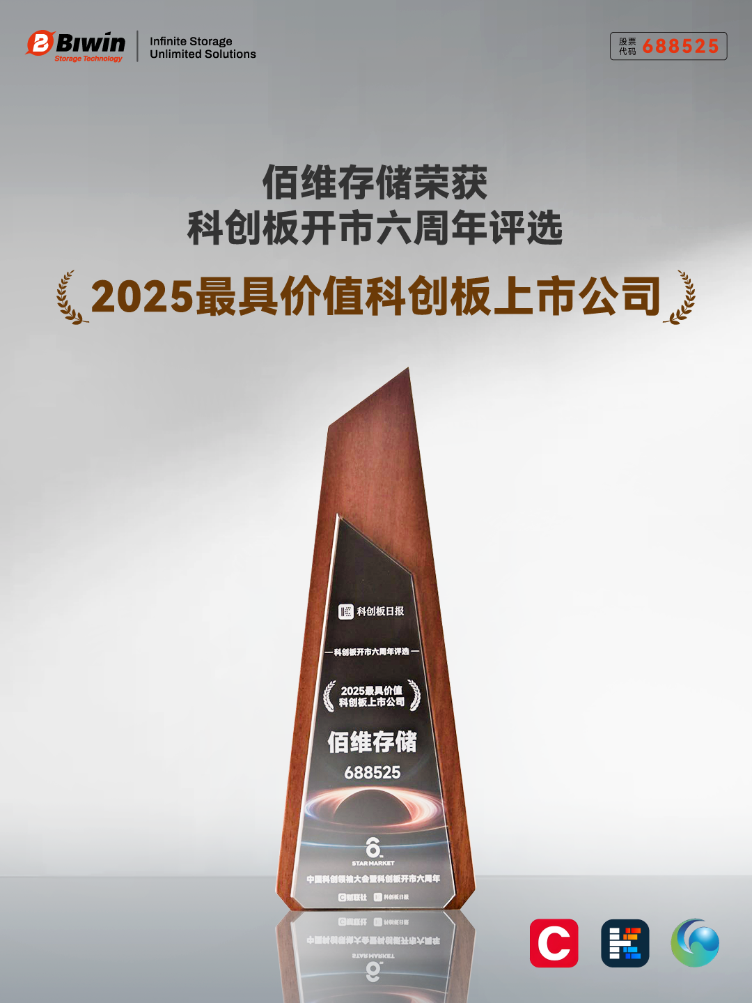 近日,由《科创板日报》、财联社与上海长三角G60科创集团联合主办的“#2025中国科创领袖大会” 圆满举办,同期重磅发布了“#科创板六周年评选” 榜单,作为科创50成分股,佰维存储(股票代码:688525)再度入选“#2025最具价值科创板上市公司”,标志着资本市场对公司在技术创新、产业布局与长期价值创造上的持续认可。