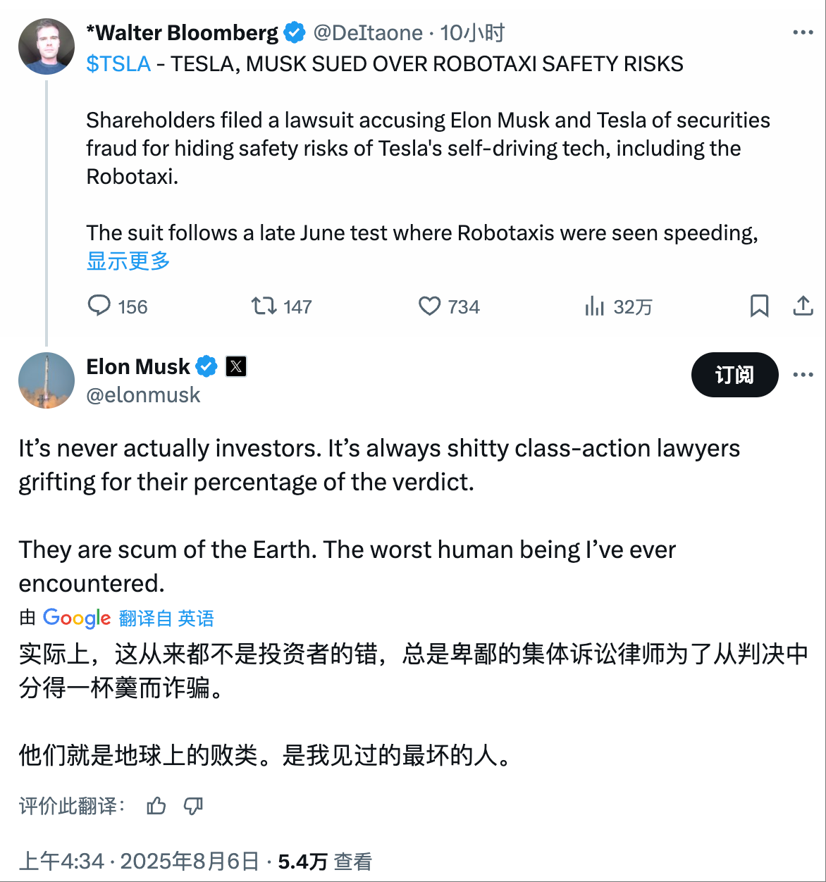 马斯克周二在X上就本案做出回应,痛批这些股东的律师。“其实,这些诉讼从来都不是投资者推动的,总是卑鄙的集体诉讼律师为了从判决中分得一杯羹而诈骗。他们就是地球上的败类。是我见过的最坏的人。”马斯克称。