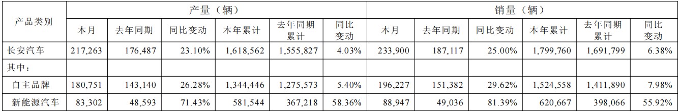 快报数据显示,8月,长安汽车产量为217,263辆,同比增长23.1%,今年累计产量为1,618,562辆,同比增长4.03%;长安汽车8月销量为233,900辆,同比增长25%,今年累计1,799,760,同比增长6.38%。