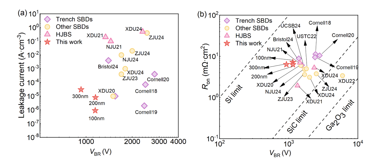 图2 (a) 垂直二极管的漏电流与击穿电压基准性能对比,(b) 本工作中β-Ga2O3垂直二极管和沟槽SBD的导通电阻与击穿电压基准性能对比,以及文献中报道的结果对比。