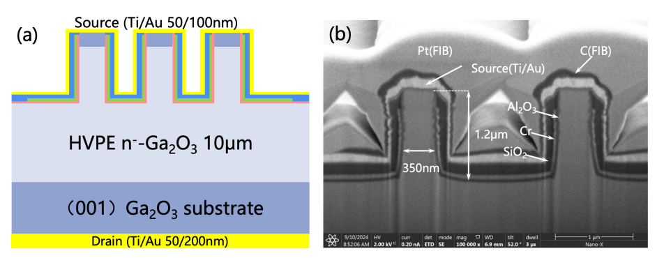 图3 (a) 多鳍通道 β-Ga2O3 FinFET示意图,(b)鳍宽300 nm二极管 SEM 横截面图像。