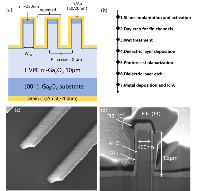 图 1 (a) 多鳍通道 β-Ga2O3二极管的示意图,(b) 器件的关键工艺步骤,(c)鳍干法蚀刻后的扫描电子显微镜(SEM)图像, (d) 鳍宽400 nm二极管 SEM横截面图像。