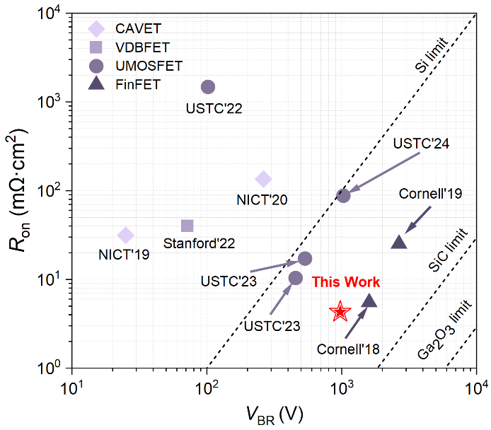 图4 最新垂直β-Ga2O3 MOSFET器件的Vbr与R(on,sp)性能对比图。