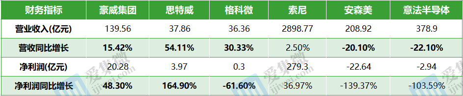 本文分别选取A股公司豪威集团(603501.SH)、思特威(688213.SH)和格科微(688728.SH),美股公司索尼(SONY.N)、安森美半导体(ON.O)和意法半导体(STM.N)进行比较。