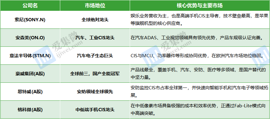 纵观全球CIS行业格局,索尼(SONY)凭借其在高端手机传感器领域的绝对优势,依然是无可争议的技术和市场领导者。其产品是苹果等旗舰手机的“心脏”,定义了行业的技术标杆。安森美(ON)和意法半导体(STM)则分别是汽车与工业视觉、汽车电子生态领域的巨头,拥有深厚的客户基础和车规级认证壁垒。
