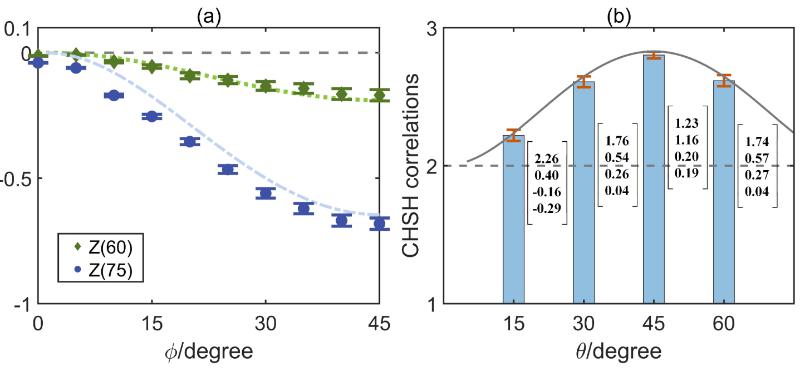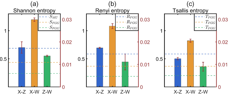 团队进一步利用双光子纠缠系统开展实验,运用统一方法验证了三类熵不确定性关系(图2)以及量子相干性与量子贝尔非定域性(图3),实验结果以很高的精度符合不确定关系的理论预测。