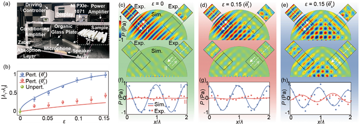 实验结果显示,沿不同扰动方向,系统分别呈现线性和平方根响应,测量数据与仿真模拟高度一致,充分验证了HP在开放系统中表现出的各向异性灵敏度(图3)。此外,对比扰动前后的散射场可见,沿非线性方向的微扰导致散射场发生明显变化,而沿线性方向则保持较有序的波传播特征,进一步体现了该HP的方向依赖特性。