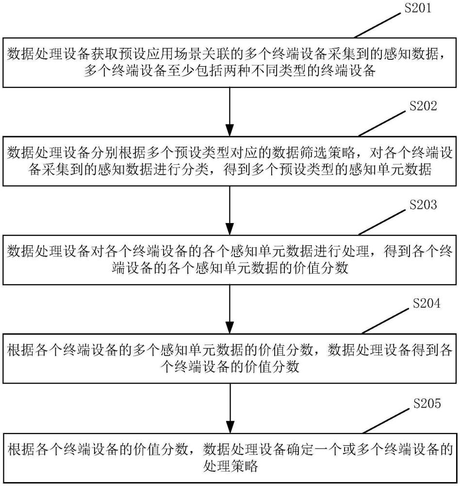 本申请实施例公开了一种数据处理方法、装置及设备,该方法包括:数据处理设备获取预设应用场景关联的多个终端设备采集到的感知数据;数据处理设备分别根据多个预设类型对应的数据筛选策略,对各个终端设备采集到的感知数据进行分类,得到多个预设类型的感知单元数据;数据处理设备对各个终端设备的各个感知单元数据进行处理,得到各个终端设备的各个感知单元数据的价值分数;根据各个终端设备的多个感知单元数据的价值分数,数据处理设备得到各个终端设备的价值分数;根据各个终端设备的价值分数,数据处理设备确定一个或多个终端设备的处理策略。采用本申请实施例,可以根据终端设备的价值分数,优化预设应用场景中各个终端设备的部署。