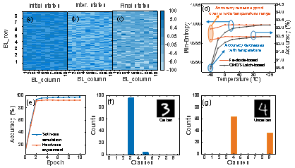依托这一理想随机熵源,团队基于3D 16层Fe-diode阵列开发了具有统一熵源及突触权重的贝叶斯神经网络芯片。测试结果显示,该芯片可在25 fJ/program的超低能耗下完成原位训练,MNIST识别准确率92.4%;NIST随机性测试最小熵为0.9997,印证了噪声的高纯度与独立性;芯片面积仅为0.06 F²/state,工作温度覆盖−40 °C~125 °C,为边缘高可靠、低功耗AI推理提供了可规模化的随机熵源新范式。