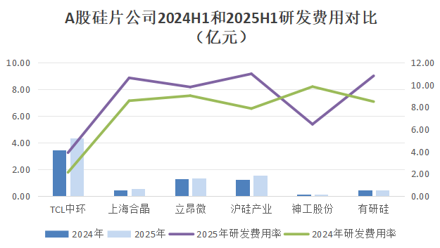 研发费用率(研发费用/总营业收入)方面,立昂微与神工股份有所下降,TCL中环、上海合昌、沪硅产业、有研硅均有提升。立昂微从2024年上半年的9.02%降到2025年上半年的8.17%;神工股份从9.84%降至5.38%。TCL中环则从2.13%增至3.25%;上海合晶从8.57%增至8.85%;沪硅产业从7.87%增至9.16%;有研硅从8.49%增至9.01%。
