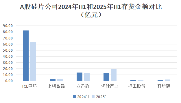 提升企业运营能力,是改善盈利不足的重要手段。存货情况在一定程度上,可以反映出企业产品结构、市场定价能力和盈利能力的变化。A股硅片公司2024年H1和2025年H1存货金额情况来看,TCL中环从2024年上半年的82.33亿元降至63.17亿元;上海合晶从3.28亿元降至3.01亿元;立昂微从13.49亿元降至13.11;神工股份从1.27亿元降至1.07亿元。整体有所好转。