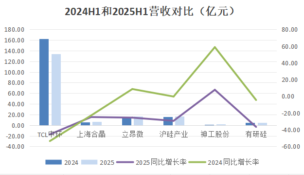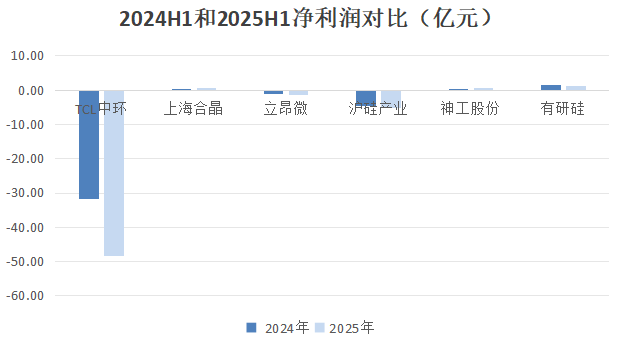 不过从近期发布的2025年半年报来看,国内硅片企业在产能提升、营收增长的同时,难掩盈利能力不足的隐忧。例如,TCL中环虽然实现营业收入162.13亿元,营收金额最高,但与去年同期相比下降17.36%,净利润方面更是出现48.36亿元的亏损。沪硅产业2025上半年虽然营收增长,从2024年同期的15.69亿元增长到16.97亿元,但净利润却出现5.19亿元的亏损。这种营收增长但净利亏损的企业还有立昂微,营收从2024年上半年的14.59亿元增长到2025年上半年的16.66亿元,但净利润亏损1.51亿元。