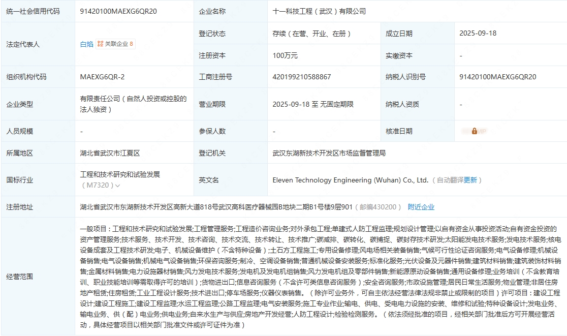 集微网消息(文/罗叶馨梅)企查查APP显示,近日,十一科技工程(武汉)有限公司成立,经营范围包括碳减排、碳转化、碳捕捉、碳封存技术研发,太阳能发电技术服务及发电技术服务等。